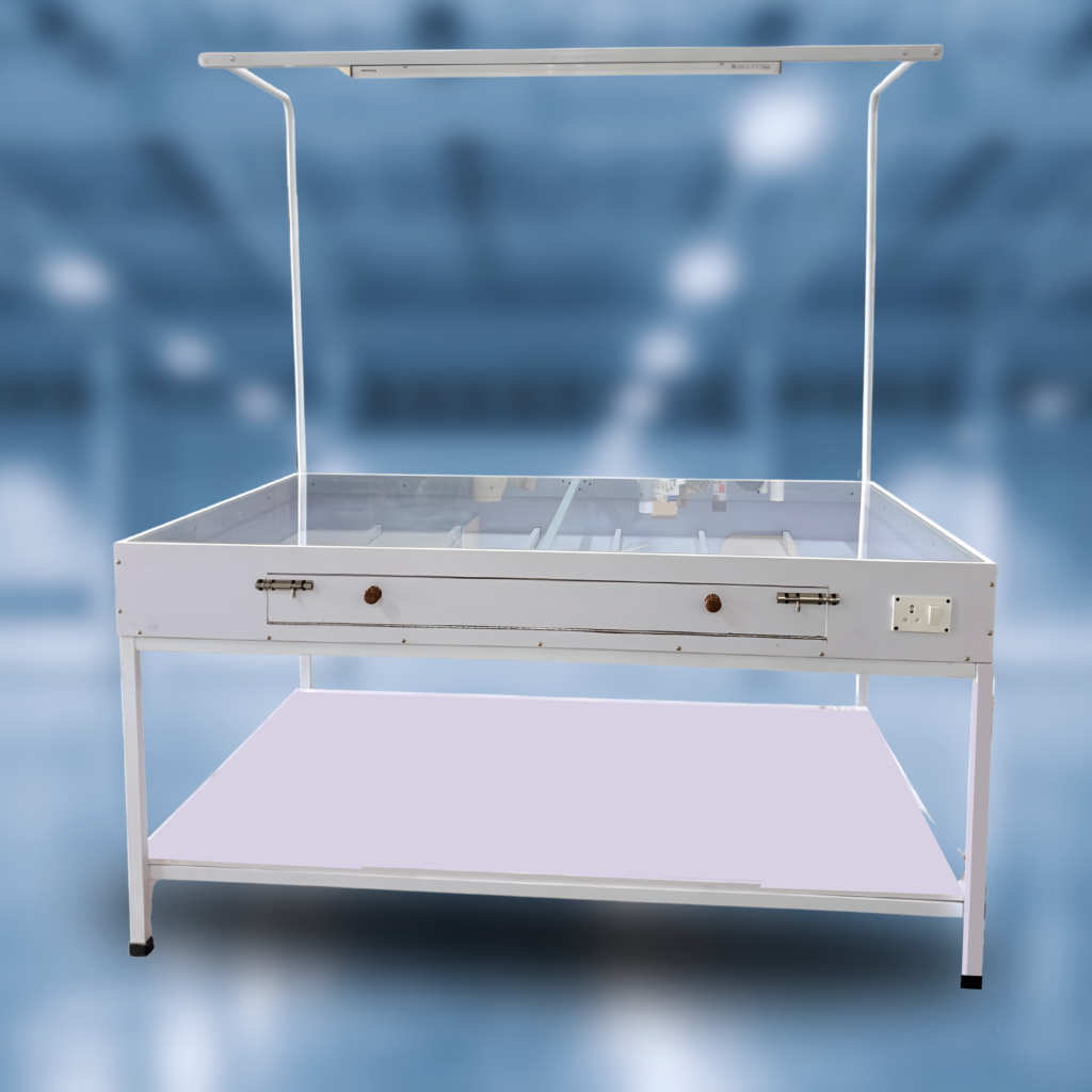The Inspection Table is designed for checking and inspecting garments or fabrics during the production process. It helps quality control teams identify defects, stains, stitching issues, or fabric damage before the product moves to the next stage of manufacturing. This table provides a large working surface and proper lighting arrangement,